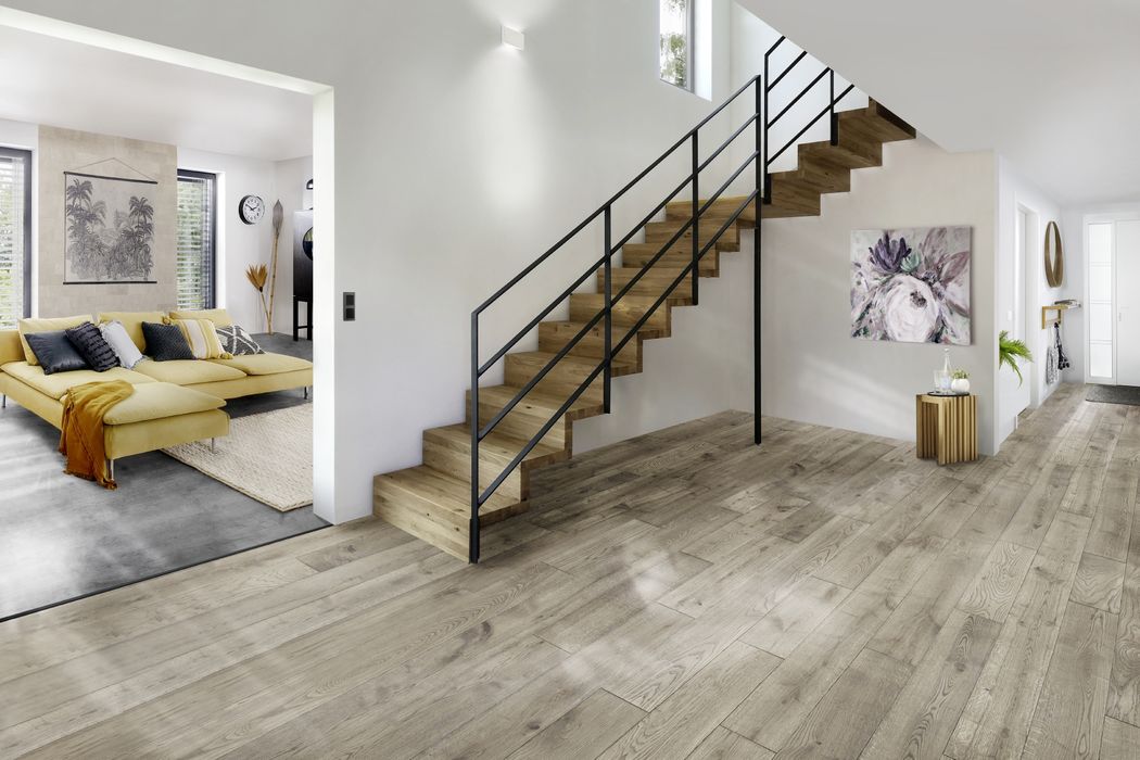 Halbgewendelte Faltwerktreppe mit Geländerfüllung grau Linea 728
